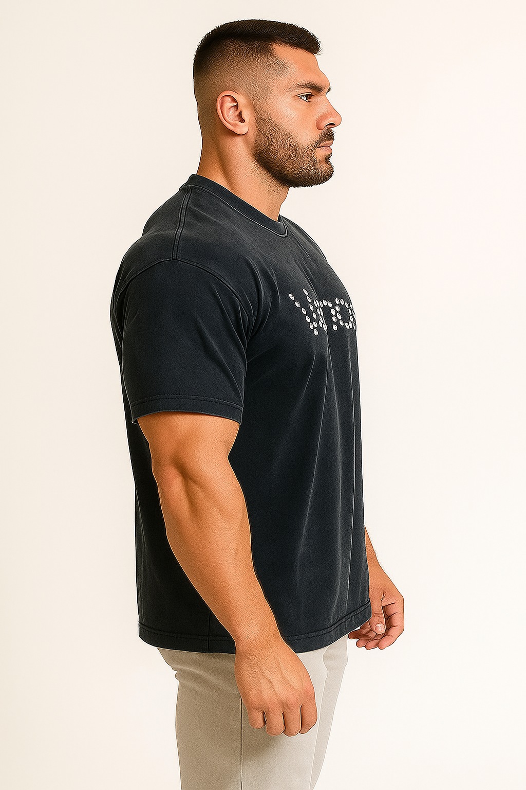 Elevate your casual wear with the Vamos Crystal Stud Tee. Crafted from premium heavyweight cotton, this t-shirt combines bold attitude with refined detail. The word “Vamos” is emblazoned across the chest using individually placed crystal studs, giving it a modern, standout sparkle without overpowering its sleek silhouette. Designed with a relaxed fit, dropped shoulders, and a slightly vintage washed effect, this tee offers both comfort and statement-worthy edge. Perfect for styling solo or layering under a jacket.